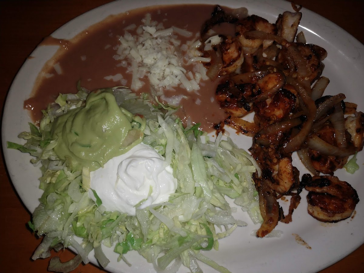 Chicken Shrimp Mushrooms and Onions over Rice with Cheese Poured over Top
